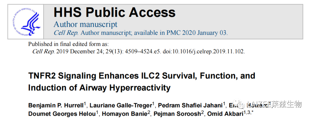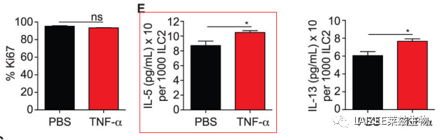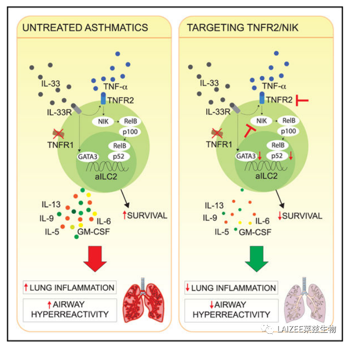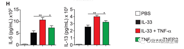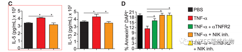 4. TNFR2和NIK信号增强hILC2受体小鼠AHR的诱导 接下来发现,在TNF-α刺激下,hILC2分泌更高水平的IL-5和IL-13。当阻断TNFR2时,这种现象被抑制。