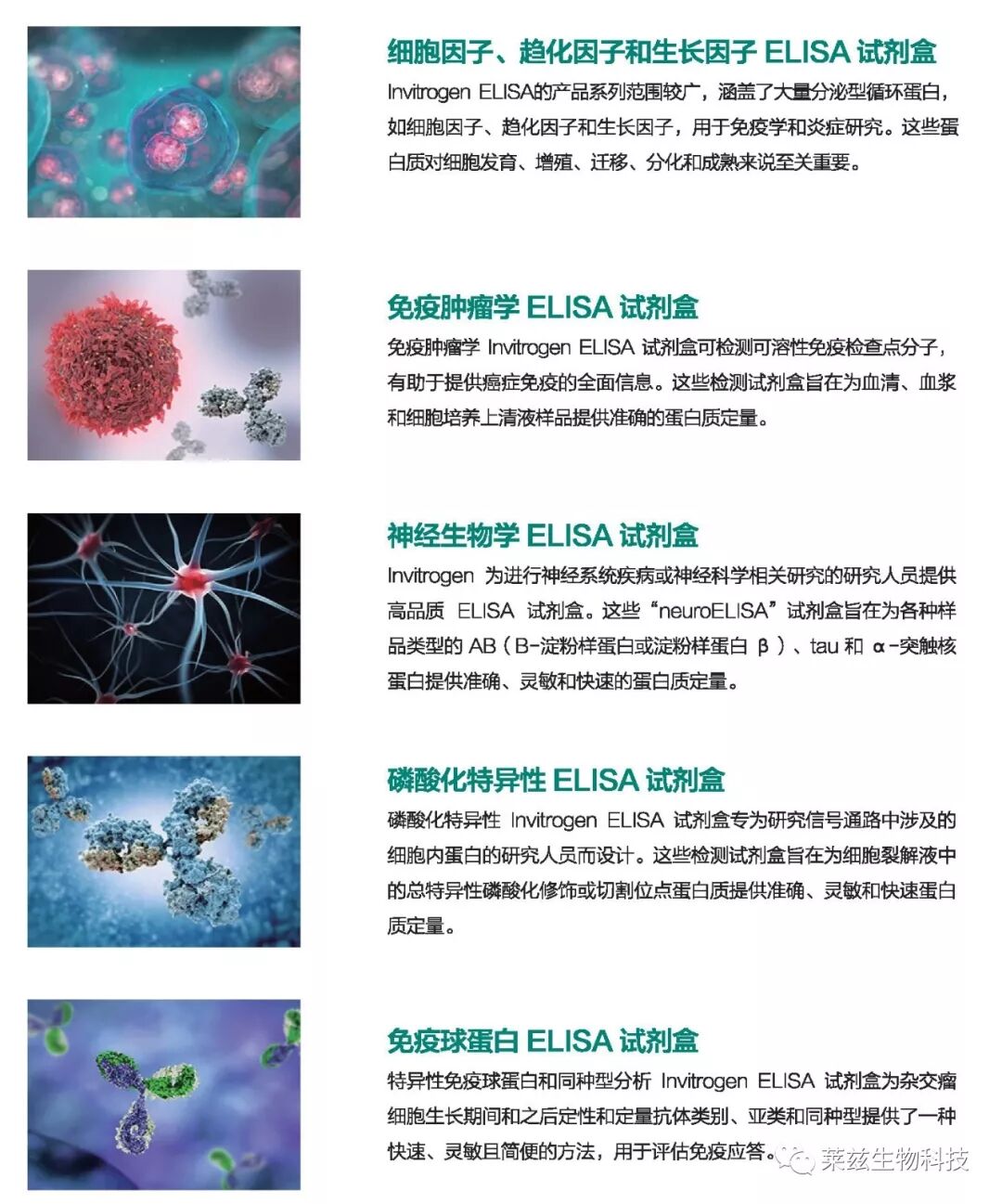 Invitrogen ELISA——高品质ELISA试剂盒 热烈庆祝莱兹生物科技有限公司成为Invitrogen ELISA产品线北京和上海地区代理! Invitrogen ELISA试剂盒以及其他免疫分析试剂都使用相同抗体对为研究项目提供稳固的支持。这也实现了不同蛋白因子检测平台的转换,例如从多因子分析转到ELISA,并得出稳定可比较的数据。 • 任何时间点检测与您的研究领域相关的因子,保持研究的相关性 • 使用来自之前实验平台的数据来节省资源 • 利用在多个平台之间都完全相同的抗体对,根据您研究样品量的不同选择不同平台来进行验证。