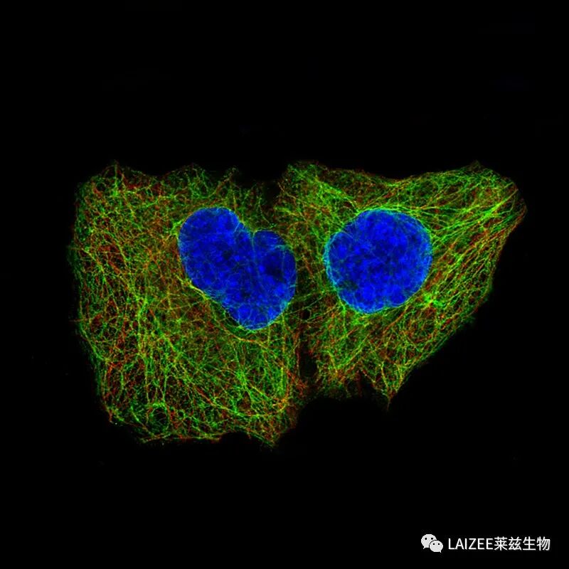 使用Anti-FRMD5 Antibody (AMAb91580)对人心肌和胎盘组织进行免疫组织化学分析。针对相同的组织提供了相应的FRMD5 RNA序列数据。 使用Anti-KRT5 antibody (AMAb91549)对A-431细胞进行免疫荧光染色,结果显示在中间丝有特异性染色(绿色),微管和细胞核分别显示为红色和蓝色(如有)。