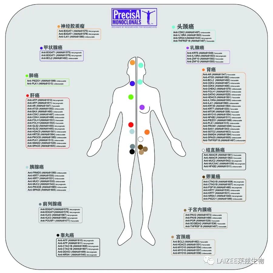 ATLAS人类癌症标志物抗体图谱发表时间:2021-10-22 18:27 ATLAS人类癌症标志物抗体图谱 利用抗体识别癌症标志物是一种在癌症诊断、筛查和研究中广泛应用的方法。癌症标志物特异性抗体可用于检验患者血液、尿液或组织中癌症标志物含量是否升高,用于癌症诊断和预后评估。每种癌症标志物都可能与一种或多种癌症有关。 下面这张示意图总结了来自Atlas Antibodies公司的一些单克隆抗体,它们根据癌症类型以及相关的有利或不良的临床结果的预后基因进行归类。这个分类的基础来源于Atlas病理学图谱,人类蛋白质图谱的一部分(proteinatlas.org)。Atlas的网站能轻松获得所有表征数据。