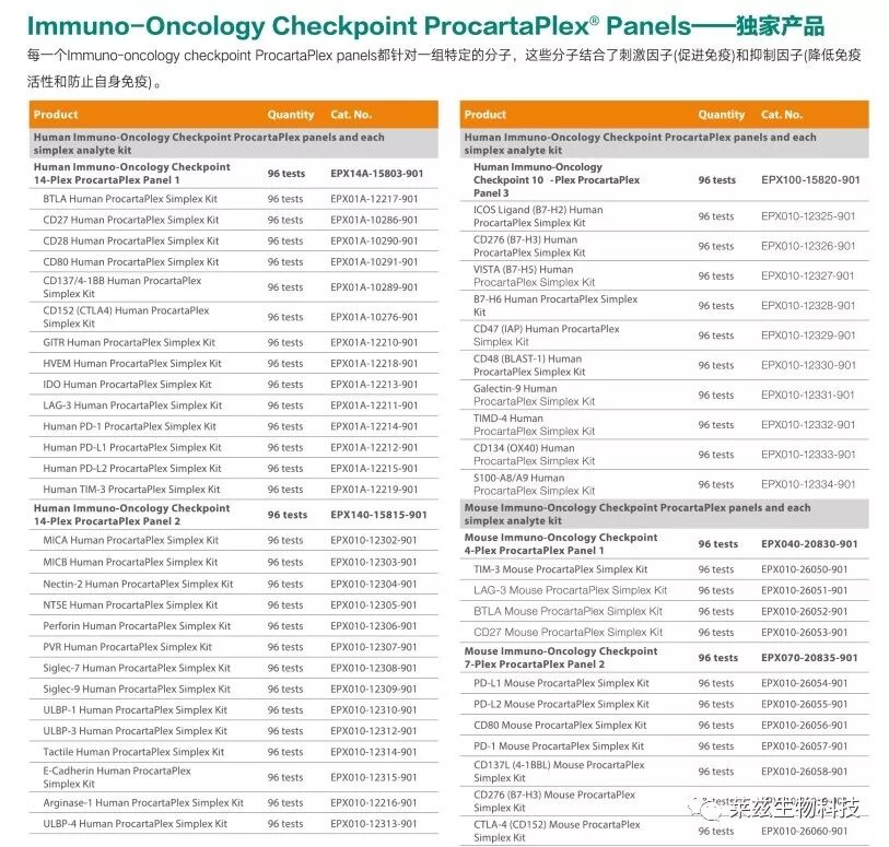 ProcartaPlex®——肿瘤免疫检测点发表时间:2019-12-06 14:13 人类的免疫系统已经进化到可以保护多细胞机体的完整性对外界环境的威胁,如由于致癌而形成的恶性细胞。许多新的抗癌疗法目的是激发免疫系统的能力对抗癌症。癌症免疫治疗的目标是启动癌症免疫的自我维持循环,克服消极的反馈机制,避免免疫抑制分子产生。 T细胞和自然杀伤(NK)细胞是对抗恶性细胞的重要分子,可以用Immuno-Oncology Checkpoint ProcartaPlex® Panel检测可溶性受体和配体。 产品特点
