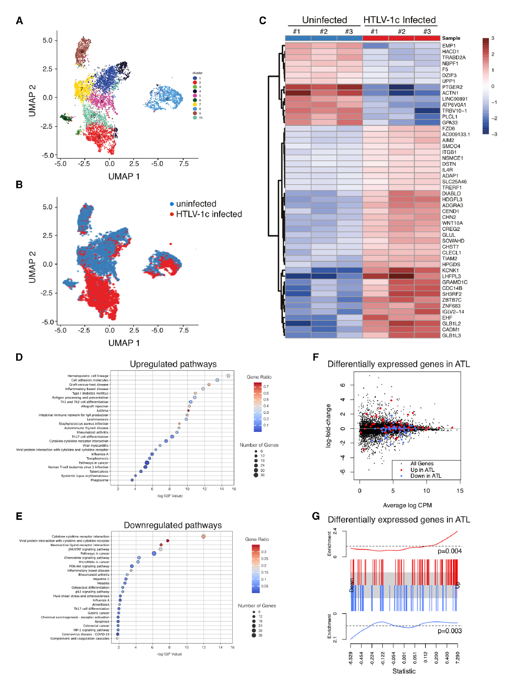 对3只未感染和3只HTLV-1c感染动物的CD4⁺CD45RO⁺记忆T细胞进行scRNA-seq分析,共纳入9131个细胞(41.6%感染,58.4%未感染),98.9%为 CD4⁺T细胞。 分析鉴定出10个细胞簇,感染与未感染细胞基因表达差异显著,除第8簇外均处于G1/G0 期,第9簇(CD4⁺Treg)以未感染细胞为主。筛选出的50个核心差异基因涉及细胞黏附、T细胞分化等通路,含HTLV-1感染标志物 CADM1;且差异基因与人类 ATL 患者基因表达高度一致,证实模型与人类疾病的相关性。 ![]() 图3.人源化小鼠的HTLV-1c感染导致了与人类ATL患者相似的广泛转录变化(A)UMAP显示来自模拟和HTLV-1c感染动物的CD4+记忆T细胞聚集。(B)来自三只未感染(蓝色)和三只HTLV-1c感染(红色)动物的CD4+记忆T细胞的scRNA-seq聚类图。(C)三只未感染HTLV-1c的动物和三只感染HTLV-1c的动物之间的CD4+记忆T细胞差异表达基因前50名,按错误发现率排序。只显示了与非周期细胞子集(不包括第8簇)绝对折叠变化的基因。(D和E)(D)与未感染的动物相比,HTLV-1c感染的CD4+记忆T细胞中前25个KEGG通路上调,(E)前25个KEGG通路下调。(F)MA图,比较HTLV-1c感染和未感染的CD4+记忆T细胞的基因对数变化2倍和每百万对数的平均对数。在人类ATL患者中上调的基因以红色显示,而在人类ATL中下调的基因以蓝色显示。(G)条形码图谱显示,在HTLV-1c感染的人类ATL中,与未感染的CD4+记忆T细胞相比,ATL中的基因表达显著上调(红条,图上),而人ATL中的基因表达显著下调(蓝条,图下)。每一组的富化线显示了曲线图每个部分中垂直条的相对富集度。