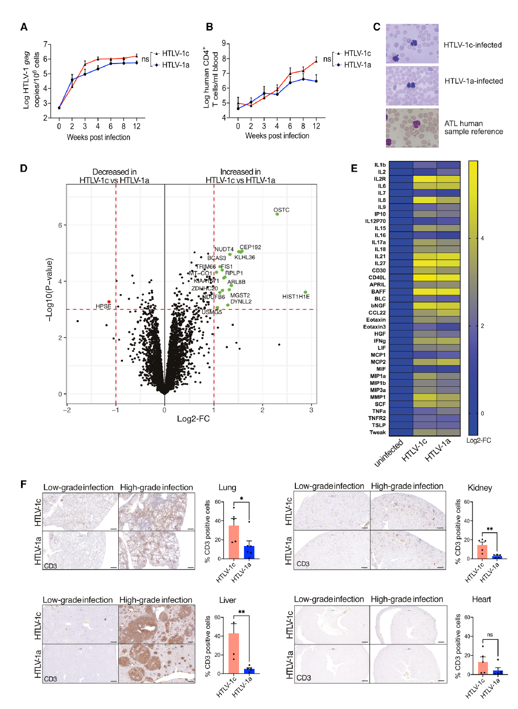 利用模型来揭示HTLV-1c和HTLV1a之间潜在的亚型特异性致病性差异,这两个亚型在核苷酸水平上是最具差异的HTLV-1亚型。HTLV-1c 感染小鼠的病毒载量扩增速度略快于 HTLV-1a,12 周时前者病毒载量为后者的 2.76 倍;HTLV-1c 感染小鼠达到疾病伦理终点的比例更高(16 周时 HTLV-1c 组存活率 30%,HTLV-1a 组 70%)。 蛋白质组分析显示,HTLV-1c感染CD4⁺T细胞中有17种蛋白表达水平显著高于HTLV-1a感染细胞,包括HIST1H1E、OSTC等与细胞增殖和炎症相关的蛋白。 使用Procartaplex65因子试剂盒(Immune Monitoring65-Plex Human ProcartaPlex Panel,EPX650-10065-901)检测小鼠血清中促炎细胞因子/趋化因子(IL-8、IP-10、TNF等),HTLV-1c感染小鼠血清中的促炎细胞因子 / 趋化因子平均升高幅度更大,且肺部CD3⁺T细胞浸润在重度感染时显著高于HTLV-1a感染小鼠,提示其肺部致病性更强。 ![]() 图2.与HTLV-1a(A)相比,HTLV-1c自然疾病进行性感染在人源化小鼠中的侵袭性略强于HTLV-1c(红色)和HTLV-1a(蓝色)Gag基因相对于参考基因(人rpp30)在感染的Hu-NSG小鼠的外周血液中的定量,通过ddPCR测量。(B)在感染HTLV-1c(红色)和感染HTLV-1a(蓝色)的动物中,随着时间的推移,每毫升血液中的外周人类CD4+T细胞。(C)感染HTLV-1c和感染HTLV-1a的动物的外周血液涂片的代表性图像显示了核形态。放大100倍。展示人类ATL样本以供比较。(D)火山曲线图显示,与HTLV-1a感染的动物相比,HTLV-1c感染的人外周CD4+T细胞中的蛋白质表达,随后进行了定量质谱分析。(E)用多重酶联免疫吸附试验测定HTLV-1c和HTLV-1a感染动物的血清细胞因子相对于模拟感染动物的对数2倍变化。(F)感染HTLV-1c和HTLV-1a的Hu-NSG小鼠器官的免疫组织化学分析(12-16 WPI)。