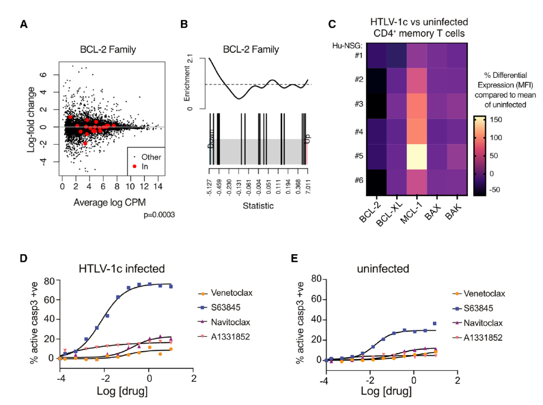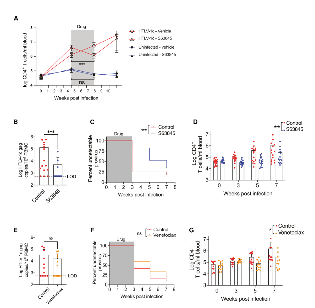 HTLV-1被认为与促进感染细胞存活的失调的细胞凋亡途径有关。一项包含已知内在凋亡bcl2家族成员的独立基因集测试确定了该基因集在HTLV-1c感染细胞与未感染细胞中的显著差异表达(p=0.0003)。单细胞RNA测序显示,HTLV-1c感染导致CD4⁺记忆T细胞内在凋亡通路失调,13个促凋亡基因和14个抗凋亡基因表达异常;蛋白水平检测发现感染细胞中BCL-2表达下调,而MCL-1表达升高1.64倍。 体外实验表明,MCL-1抑制剂S63845可高效诱导HTLV-1c感染CD4⁺记忆T细胞凋亡,1.1μM浓度下75.9%的感染细胞出现caspase-3 cleavage,显著高于BCL-2抑制剂venetoclax(11.4%)、BCL-XL抑制剂A1331852(16.7%)及多靶点抑制剂navitoclax(20.6%)。 体内实验中,S63845 治疗(25mg/kg,每周 3 次)可使 HTLV-1c 感染小鼠 CD4⁺T 细胞数量在 3 周内减少3.5倍;与 TAF+DTG 联合使用时,81% 的小鼠病毒载量降至检测下限,显著高于对照组(20%),且疾病进展延迟(中位存活时间延长 2.33 周)。 ![]() 图5.HTLV-1c感染的T细胞内固有的凋亡失调,并呈现了一个治疗靶点(A)MD图,显示了HTLV-1c感染的和未感染的Hu-NSG小鼠的CD4+记忆T细胞基因对数2倍的变化。(B)与(A)中相同的管理基因集的条形码图。(C)HTLV-1c感染的记忆T细胞与未感染的记忆T细胞比较,细胞内bcl2、bclxl、mcl1、bax和BAK蛋白的表达。热图显示N=6只感染HTLV-1c的小鼠的表达水平,而N=6只未感染的小鼠的平均表达水平。(D)来自HTLV-1c感染动物的脾CD4+记忆T细胞(经ddPCR确认)在体外暴露于一系列浓度的S63845、ventoclax、A1331852或navitoclax 24小时后呈裂解caspase-3阳性的百分比。曲线图是两个独立实验的集合。细胞表达人CD45和CD4,并切割caspase-3。(E)与(D)中来自未感染对照动物的CD4+记忆T细胞相同。