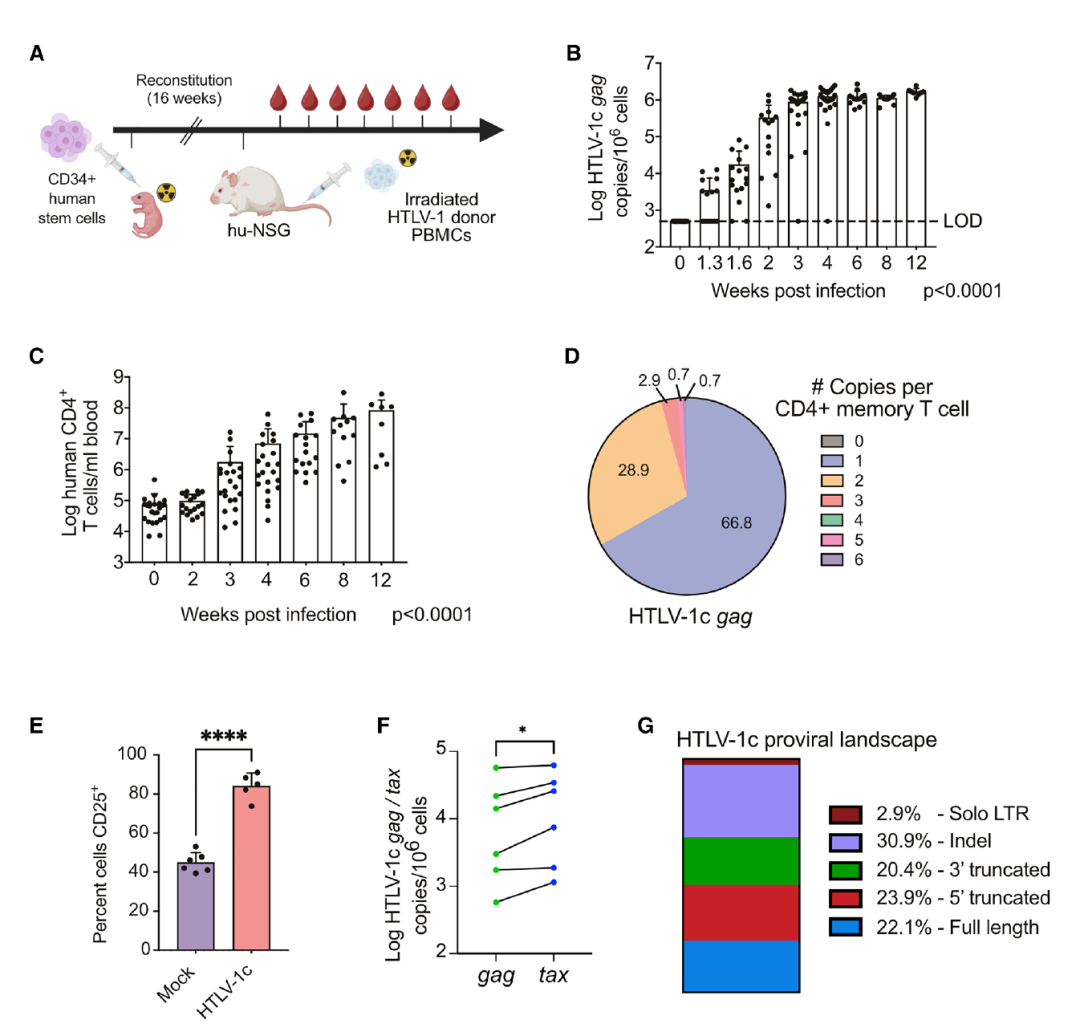使用来自HTLV-1c感染供者的外周血单核细胞(PBMC),在注射到人源化非肥胖型糖尿病(NOD)-严重联合免疫缺陷(SCID)白细胞介素2受体亚单位缺乏症(IL2RGamma)小鼠(以下称为Hu-NSG小鼠52)中进行辐射,构建HTLV-1c感染的人源化NSG小鼠模型。通过腹腔注射HTLV-1c感染供体的外周血单个核细胞(PBMC)实现感染,模型呈现快速的病毒载量升高,感染后4周病毒载量达1.24×10⁶±6.38×10⁵ gag拷贝/10⁶ PBMC,且持续维持在高水平。 模型再现人类疾病关键特征:CD4⁺T细胞显著扩增,12周时较感染前增加三个数量级;出现脾肿大和肝脏淋巴细胞浸润;记忆CD4⁺T细胞成为主要感染靶细胞,占CD4⁺T细胞总数超99%;病毒基因组以截短和缺失形式为主,仅22.1%为完整全长基因组,与人类ATL患者特征一致。 ![]() 图1.感染HTLV-1c的人源化小鼠发展与人类感染相关的疾病(A)HTLV-1感染的人源化小鼠模型。(B)用滴状数字聚合酶链式反应(DdPCR)定量检测HU-NSG感染小鼠外周血中HTLV-1c Gag基因相对参考基因(人rpp30)的动态变化。(C)在感染HTLV-1c的动物中,每毫升血液中人外周CD4+T细胞的数量。由人类CD45和CD4的表达来定义的细胞。(D)HTLV-1c从感染动物的外周血单核细胞中每人CD4+T细胞复制HTLV-1c。曲线图显示含有n个HTLV-1c Gag拷贝的细胞的部分。(E)在6WPI时,模拟感染和HTLV-1c感染的动物中CD4+CD25+T细胞的百分比。(F)通过针对N=6只感染2WPI的Hu-NSG小鼠的Gag(绿点)和Tax(蓝点)基因区域的ddPCR检测前病毒载量(PVL)和HTLV-1c拷贝数在每106个脾细胞中的分布。(G)基于连续的全基因组测序,HTLV-1c前病毒图谱位于6个WPI(71个基因组,来自N=3只小鼠),该读数映射到HTLV-1c共识基因组。