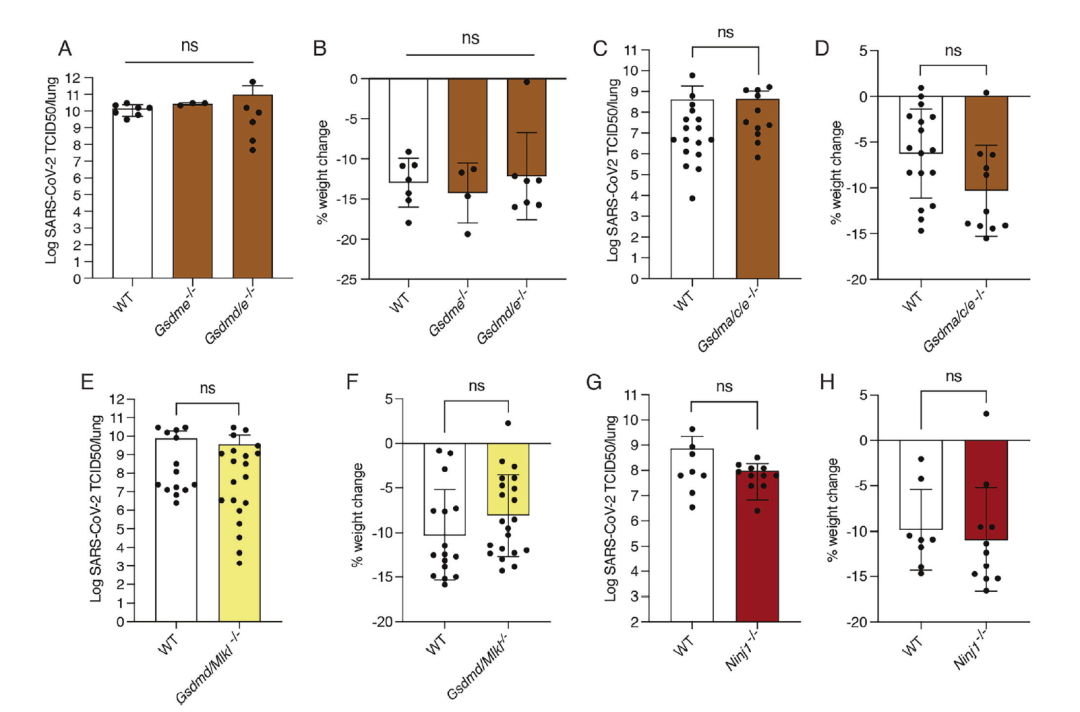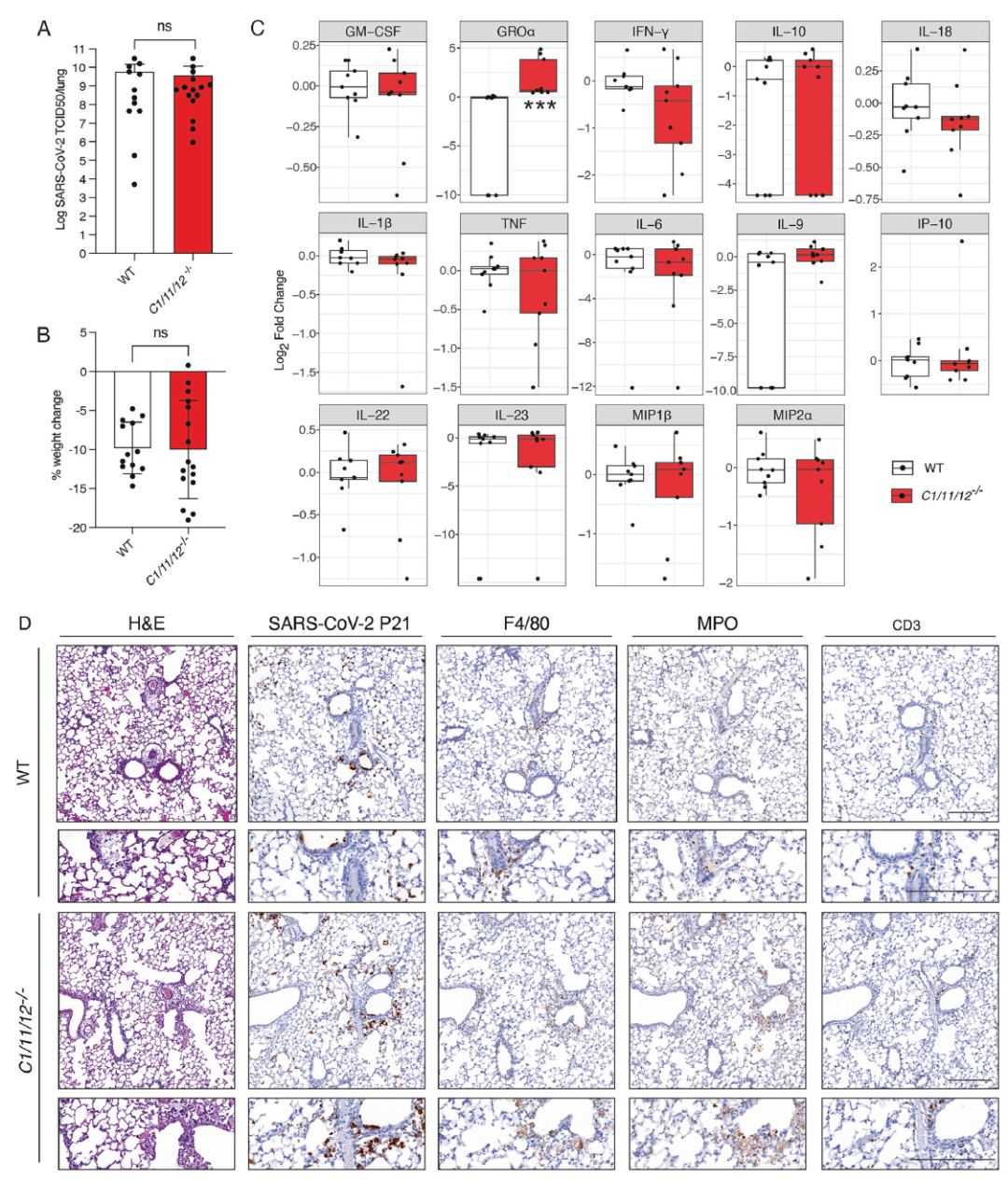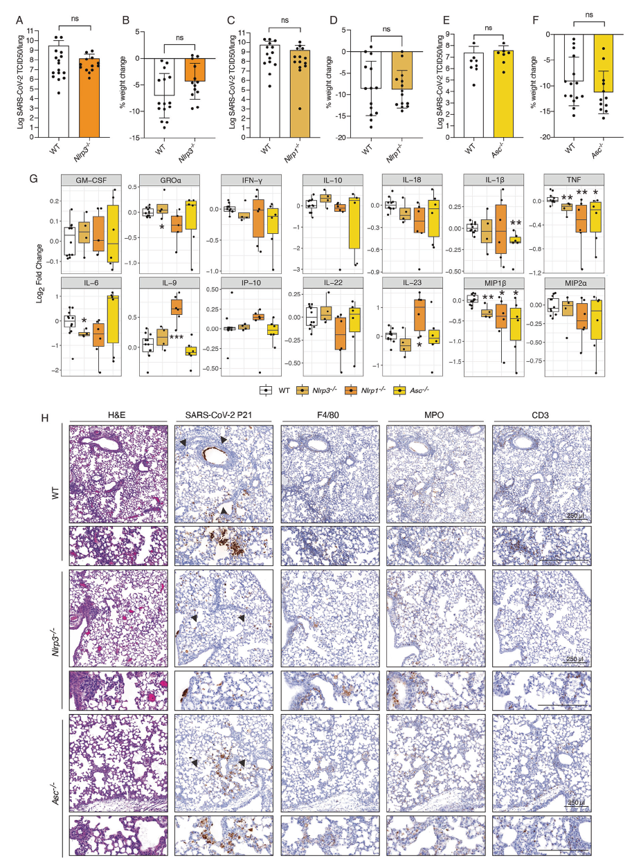 ![]() 研究方法 ![]() 动物模型与感染:使用C57BL/6背景的多种基因敲除小鼠(炎症小体相关、焦亡相关、半胱天冬酶相关、细胞因子及受体相关),感染小鼠适应型SARS-CoV-2 P21毒株(10⁴ TCID₅₀/只),监测体重变化和生存率。 病毒载量检测:通过 TCID₅₀法测定感染后不同时间点小鼠肺部病毒滴度。 炎症与病理分析:采用蛋白液相芯片技术检测肺组织匀浆中25种细胞因子/趋化因子水平;通过H&E染色和免疫组化(检测 SARS-CoV-2 核衣壳蛋白、F4/80、MPO、CD3)评估肺部病理损伤和免疫细胞浸润。 分子机制验证:Western Blot检测肺部组织中GSDMD的切割(活化)状态;免疫组化验证活化GSDMD的表达。 药物干预实验:感染当天给小鼠腹腔注射IL-1β中和抗体,或每日注射阿那白滞素,观察生存率变化。 ![]() 研究内容 ![]() 为了研究炎症体信号通路在严重的SARS-CoV-2感染诱导的疾病中的作用,使用了一种名为P21的小鼠适应株。该病毒株来源于SARS-CoV-2临床分离株,该分离株在C57BL/6小鼠中传代21次,以适应能够导致WT小鼠严重疾病的特征,特征是体重减轻和促炎细胞因子水平增加。在SARS-CoV-2感染过程中,NLRP3炎症体通路的激活被认为有助于释放具有生物活性的IL-1β和IL-18,这是与严重新冠肺炎相关的细胞因子。为了探索这些炎症小体信号的作用,构建NLRP1、NLRP3、ASC 基因敲除小鼠,用小鼠适应型SARS-CoV-2毒株P21感染该缺陷小鼠,检测病毒载量、体重变化、细胞因子水平及肺部病理,评估炎症小体对疾病结局的影响(图1)。细胞因子检测使用Cytokine & Chemokine 26Plex Mouse ProcartaPlex Panel 1(EPX260-26088-901)试剂盒进行检测。 ![]() 图1 SARS-CoV-2感染引起的炎症与炎性小体无关。WT和Nlrp3基因敲除小鼠(Nlrp3−/−)感染104TCID50/只小鼠,在感染后3d(Dpi)检测(A)肺病毒载量和(B)体重与初始体重的百分比变化。结果来自2个独立的实验(n=13-17只小鼠每种基因)。WT和Nlrp1基因敲除小鼠(Nlrp1-/-)用104只SARS-CoV-2P21 TCID50/只小鼠鼻腔攻击,并在感染后3天(Dpi)检测(C)肺病毒载量(TCID50法)和(D)体重与初始体重(每个基因14只小鼠)相比的百分比变化。WT和ASC基因敲除(ASC-/-)小鼠感染104只SARS-CoV-2P21 TCID50/只小鼠,并在3dpi时用TCID50法监测(E)肺病毒载量(每个基因型7-8只小鼠)和(F)体重与初始体重相比的百分比变化。结果来自2个独立的实验(n=12-15只小鼠每种基因)。感染SARS-CoV-2P21后3d(n=5~10只/型),用双抗体夹心酶联免疫吸附试验检测小鼠肺组织匀浆中细胞因子和趋化因子的水平。苏木精伊红(H&E)和免疫组织化学(IHC)染色肺切片检测SARS-CoV-2核衣壳、F4/80(巨噬细胞标志物)、MPO(中性粒细胞标志物)和CD3(T细胞标志物)。 无论引发焦亡和细胞因子产生的上游机制如何,细胞释放细胞因子和细胞溶解的过程主要依赖于孔形成蛋白GSDMD的激活。为了研究焦亡效应分子的功能,利用 GSDMD、GSDME、GSDMA/C/E 等焦亡相关孔形成蛋白基因敲除小鼠,结合 Western blot 和免疫组化检测 GSDMD 活化状态,验证焦亡通路是否参与 SARS-CoV-2 诱导的炎症和疾病(图2)。 ![]() 图2在SARS-CoV-2感染过程中,GSDMD不是驱动细胞因子释放和炎症的必要因素。WT和Gsdmd基因敲除(Gsdmd−/−)小鼠感染104TCID50/只SARS-CoV-2P21,并在3dpi检测(A)肺病毒载量,(B)与初始体重相比的体重变化百分比(结果来自两个独立实验,n=14-15只小鼠,每个基因型)和(C)细胞因子和趋化因子水平的测定(n=4只小鼠的肺组织匀浆)。D WT和Gsdmd-/-小鼠以104只SARS-CoV-2P21 TCID50/只小鼠鼻腔攻击,取肺组织固定于3dpi进行组织学观察。苏木精伊红(H&E)和免疫组织化学(IHC)染色肺检测SARS-CoV-2核衣壳、F4/80(巨噬细胞标志物)、MPO(中性粒细胞标志物)和CD3(T细胞标志物)的代表性图像。图像代表每个基因至少有3只动物。黑色箭头指向典型的SARS-CoV-2阳性细胞。E 6月龄WT小鼠用SARS-CoV-2P21株TCID50/只小鼠鼻内感染。Dpi后3d处死小鼠,取肺进行组织学分析。免疫组织化学(IHC)检测SARS-CoV-2核衣壳(左侧)或裂解(即激活)GSDMD(右侧)。用感染肠道病原体隐孢子虫的小鼠的小肠切片(下图)对裂解的GSDMD进行阳性对照。F Western印迹分析鼻腔感染SARS-CoV-2 P21后3天WT、ASC-/-或Gsdmd-/-小鼠全肺的免疫印迹分析(104TCID50/只)。 进一步探究了非经典焦亡途径的作用机制及相关细胞死亡通路的贡献,研究 GSDMD/MLKL(焦亡 + 坏死性凋亡)、NINJ1(多种裂解性细胞死亡的膜破裂关键分子)基因敲除小鼠的疾病表型,明确其他裂解性程序性细胞死亡是否补偿焦亡的作用(图3)。 ![]() 图3由SARS-CoV-2感染驱动的炎症与程序性细胞死亡的非规范裂解形式无关。WT、Gsdme-/-和Gsdmd/e-/-小鼠被SARS-CoV-2 P21的104只TCID50/只小鼠鼻腔感染,并在3dpi时检测(A)TCID50检测肺病毒载量和(B)与初始体重相比的体重变化百分比(n=4-7)。用104TCID50/只−/−冠状病毒P21攻击WT和GSDMA/c/e小鼠,在3dpi检测(C)肺病毒载量和(D)相对于初始体重的体重变化百分比(n=11-17个基因)。WT和Gsdmd/MLKL基因敲除(Gsdmd/MLKL-/-)小鼠感染104只SARS-CoV-2 P21 TCID50/只小鼠,在感染后3dpi用TCID50检测(E)肺病毒载量和(F)体重与初始体重的百分比变化(n=14-19只/基因)。将104TCID50/只SARS-CoV-2P21基因敲除的WT小鼠和忍者1基因敲除小鼠(Nimp1-/-)感染,并在3dpi时用TCID50法检测(G)肺病毒载量和(H)体重与初始体重(n=8-11)的百分比变化(n=8-11)。 炎症小体和下垂信号被认为与新冠肺炎的发病机制有关,因为它们与生物活性的IL-1β和IL-18的释放有关。这些细胞因子在炎症小体信号的下游被强制性地释放,并被caspase-1,-